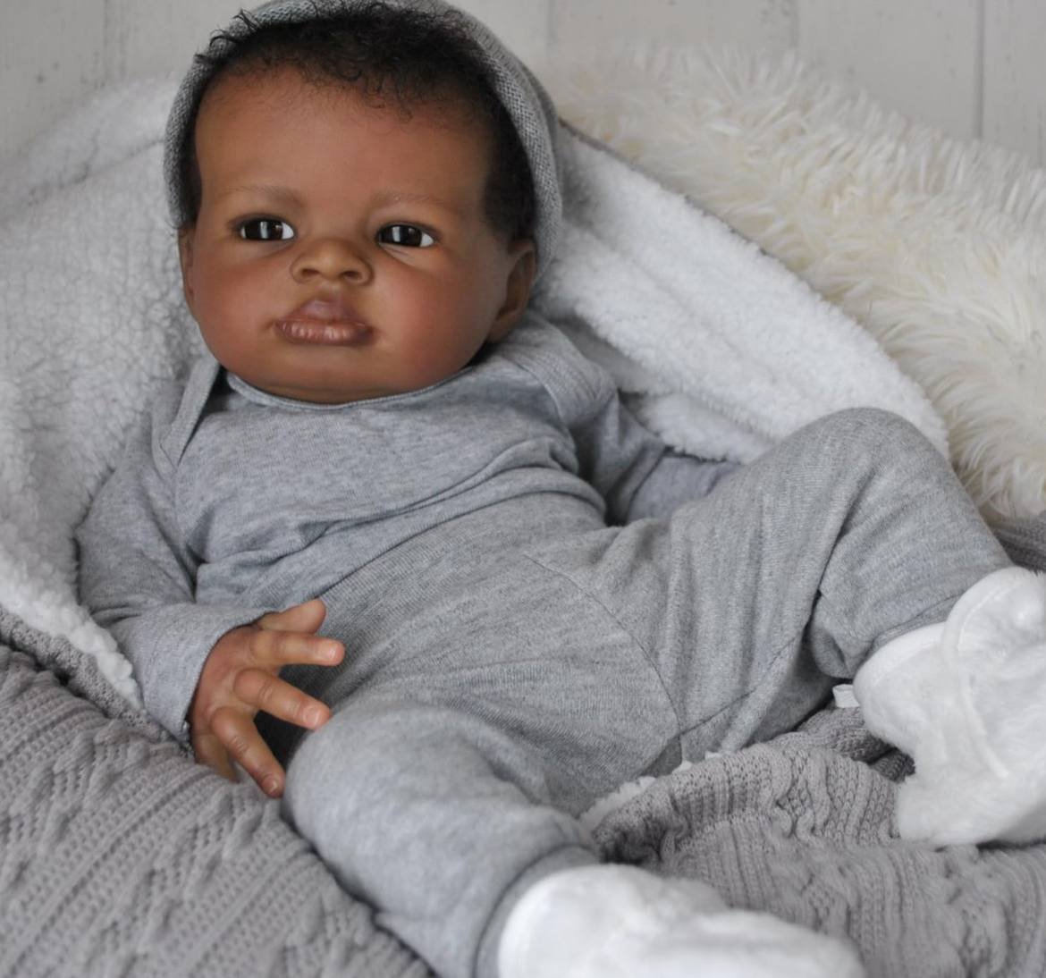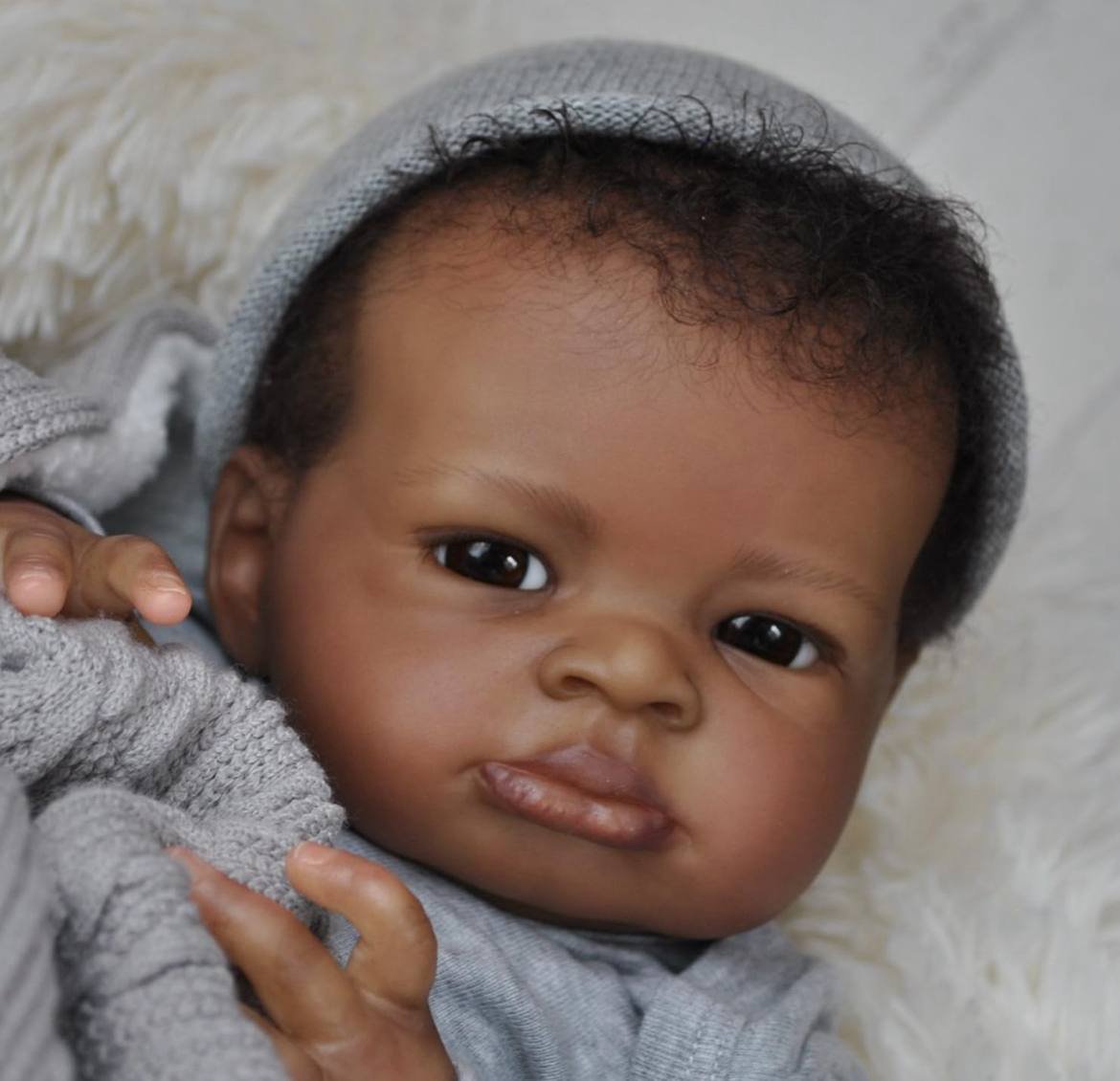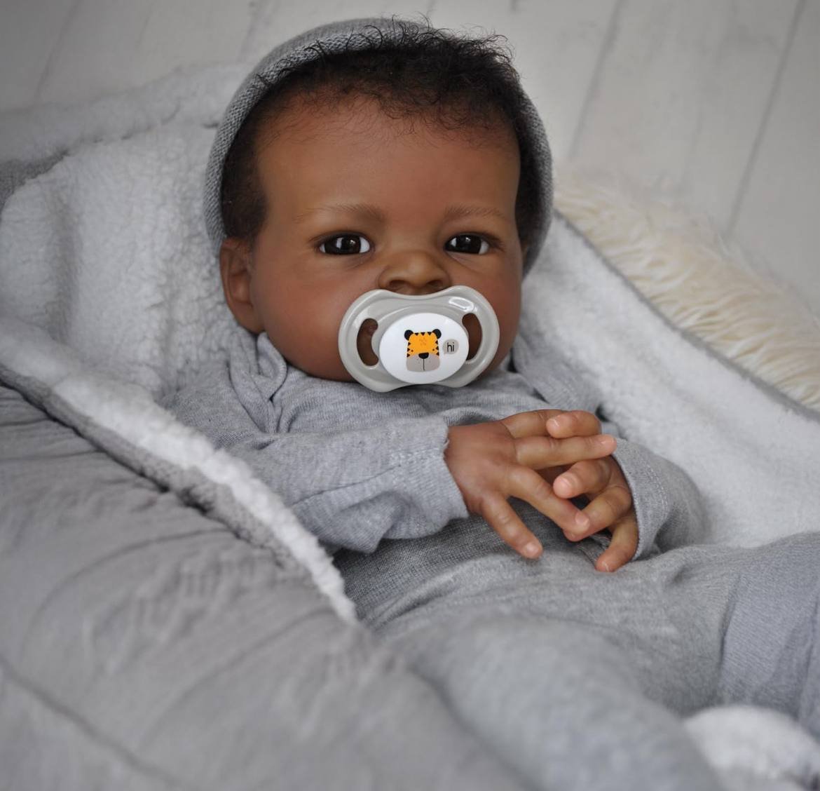 A 21-inch cuddle baby, meaning he has a silicone head and a full silicone body, including silicone arms and legs for maximum snuggle factor. Budget-friendly option with fewer paint layers. Head Material: Silicone Limb Material: full silicone body