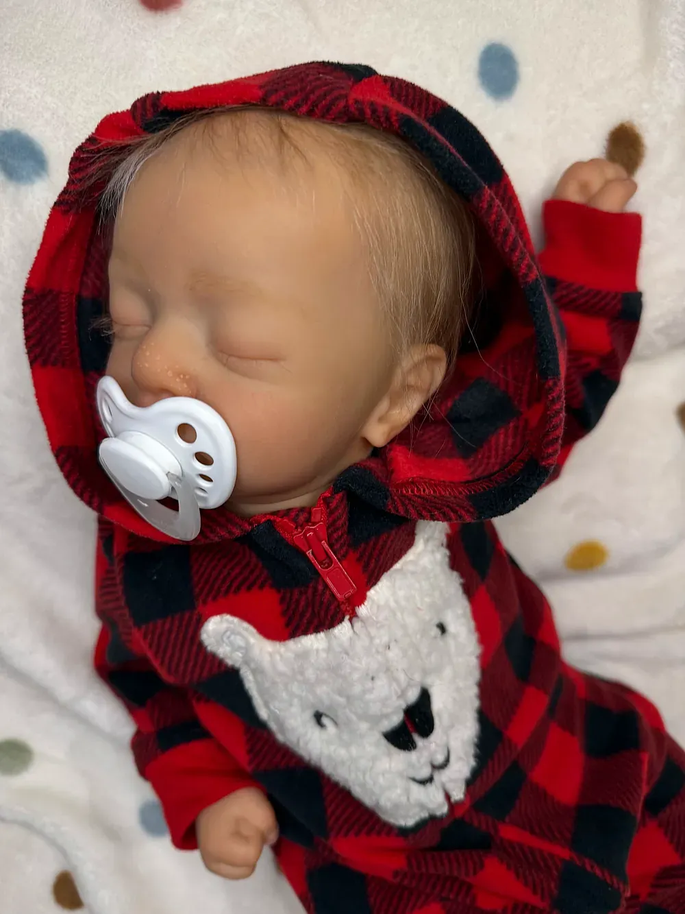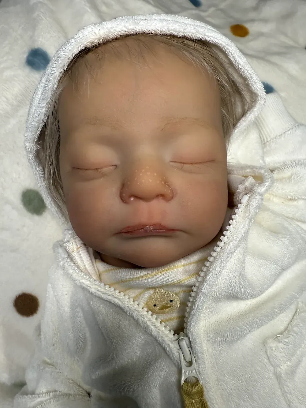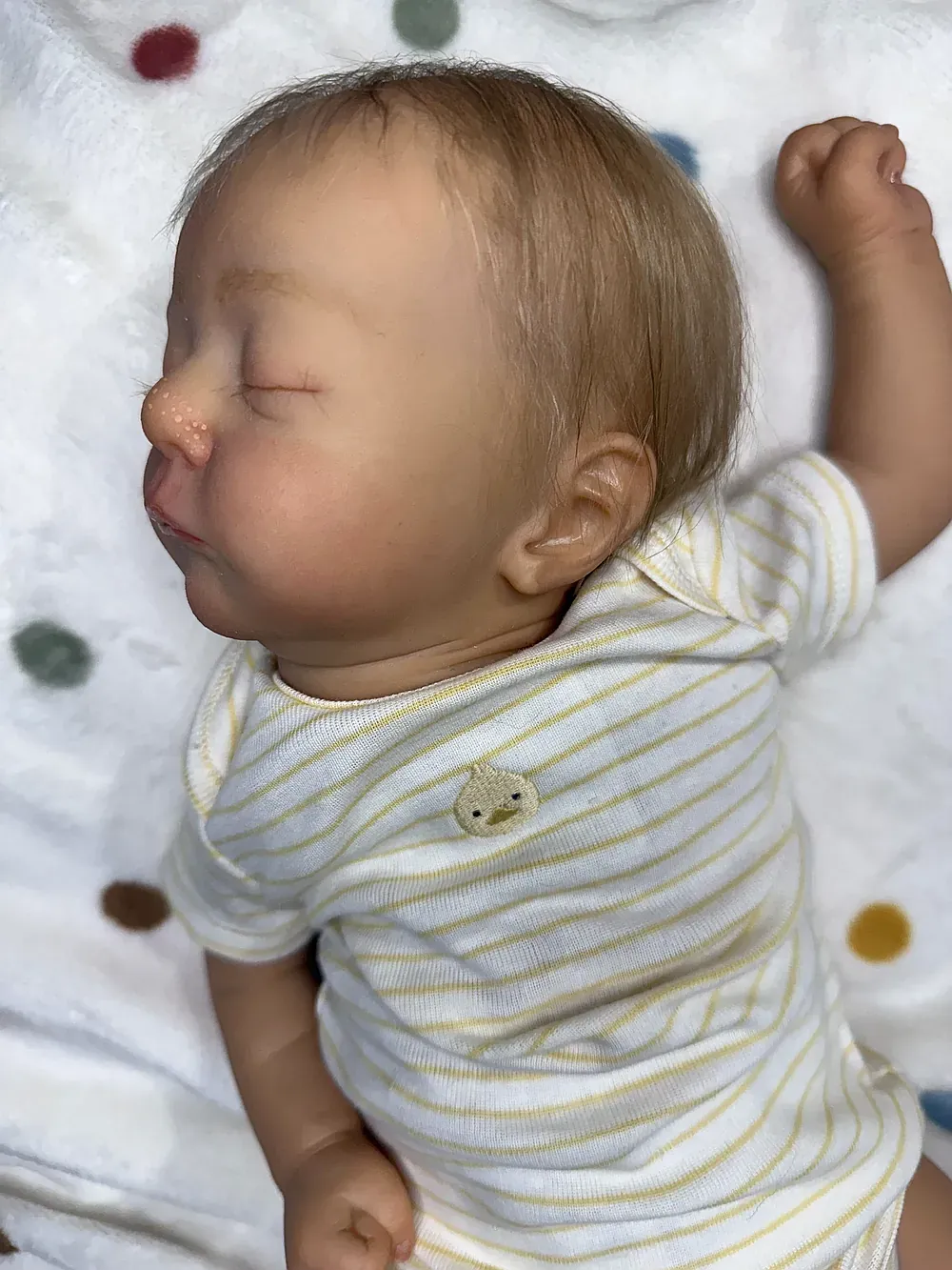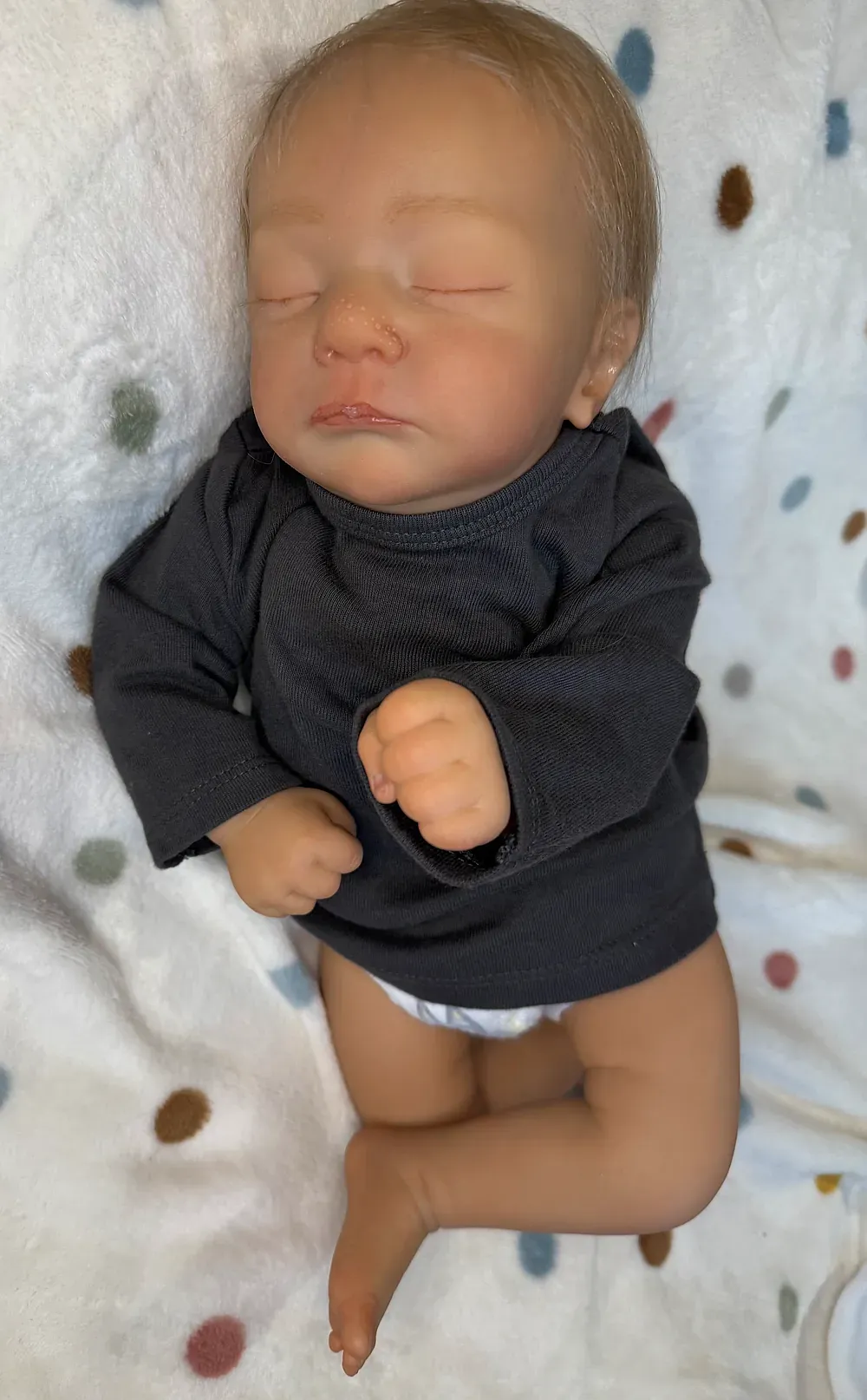 Meet Kai, an exquisitely crafted sleeping baby boy from the Elisa Marx sculpt. He features full silicone limbs on a soft cloth body, expertly painted with GHSP to achieve a warm, deep skin tone. Kai has meticulously micro-rooted black mohair and sealed, natural-looking eyelids. Weighted with fine glass beads and soft polyfil to 5 lbs 2 oz.
