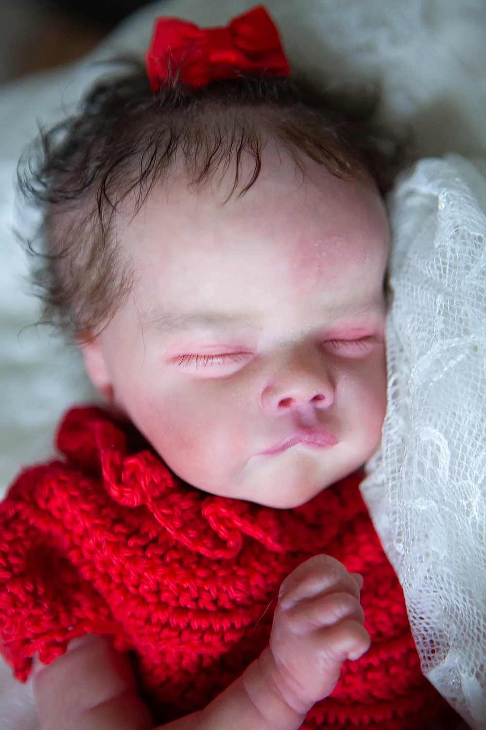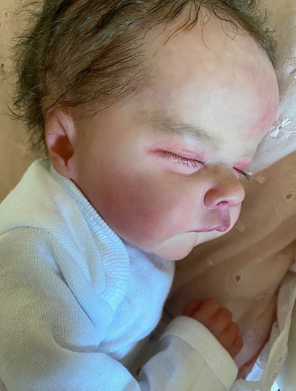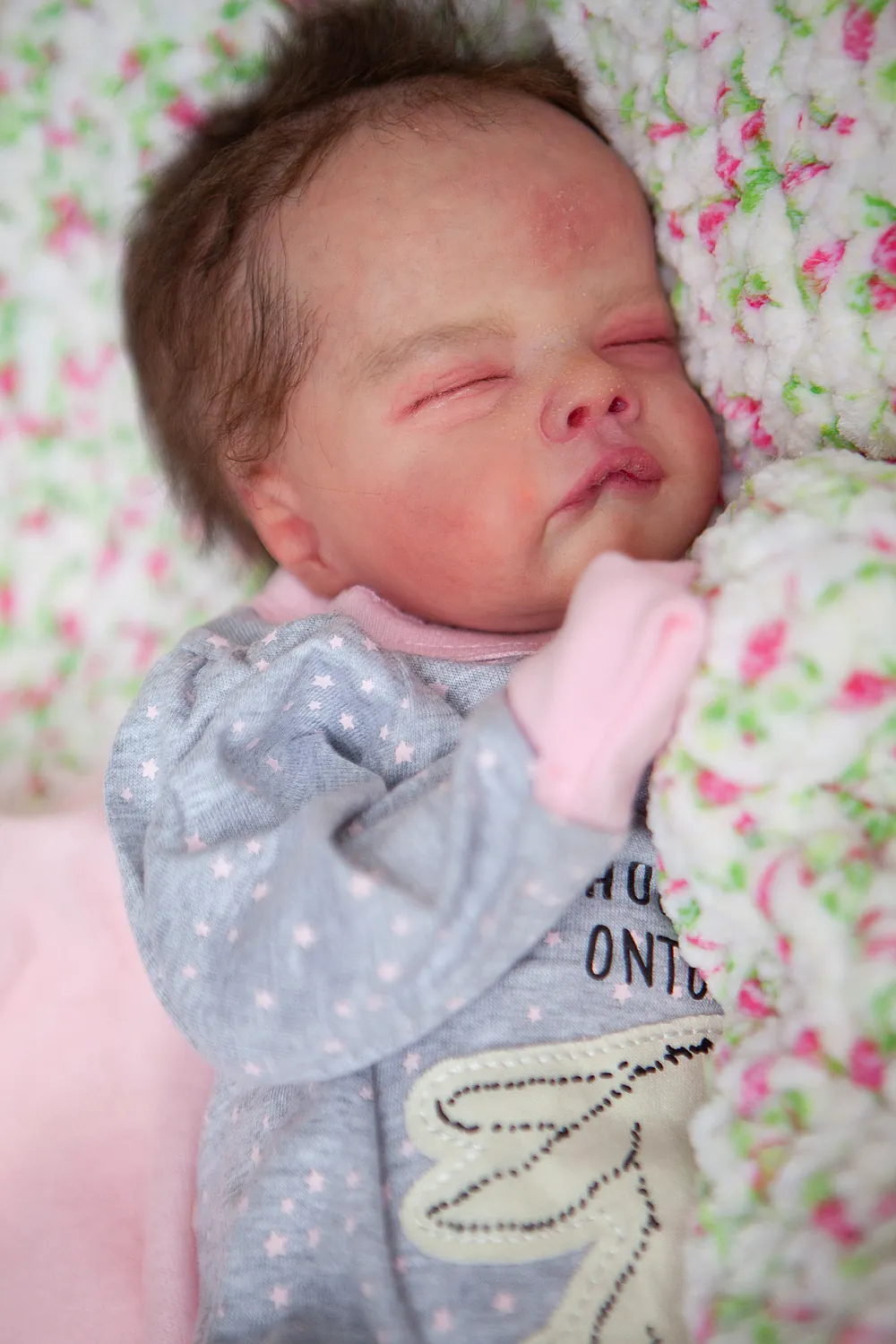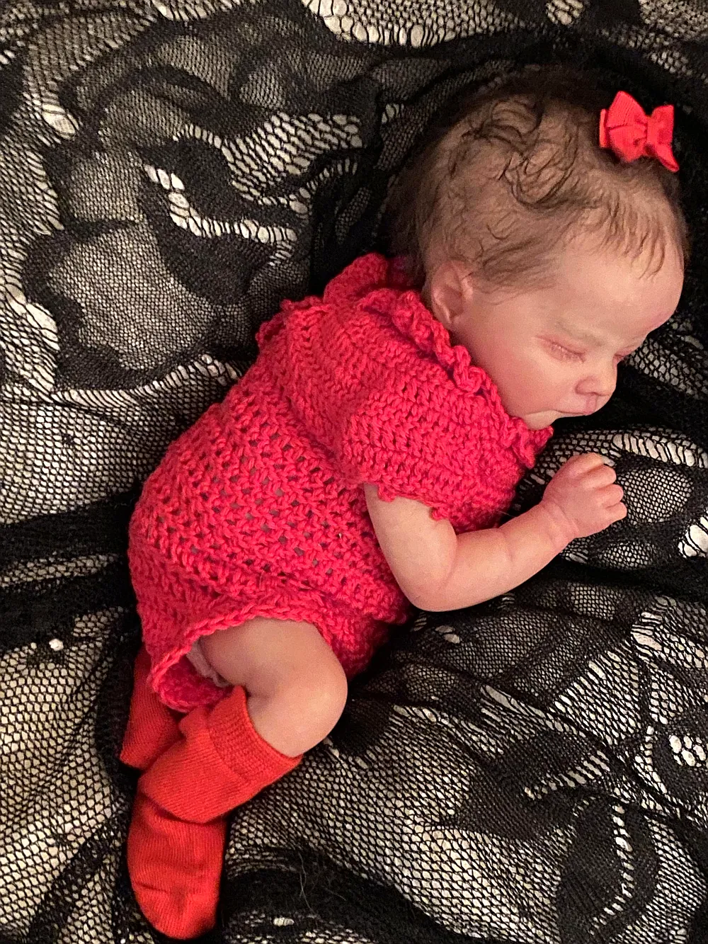 Welcome Lil Prem, an exquisite 15-inch limited edition, sleeping Preemie baby girl by master sculptor Laura Lee Eagles, rebornered by Deborah K for Dreamy Silicone Reborns. Her soft silicone limbs are professionally painted with many layers of Genesis heat set paints and sealed with matte sealer. Lil Prem features incredible newborn details like milia, capillaries, and mottled fair skin. She weighs 3 lbs 4 oz, weighted with fine glass beads and premium soft polyfill to feel like a real preemie. Her hair and lashes are directional micro rooted with premium deep dark brown mohair.