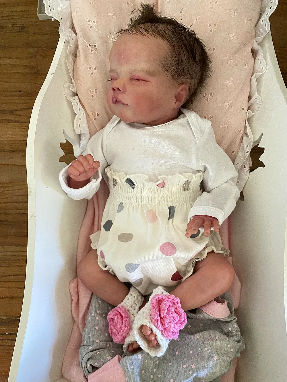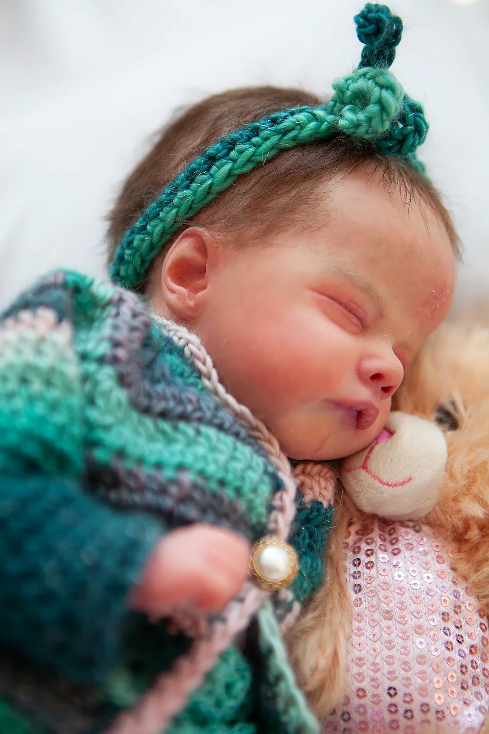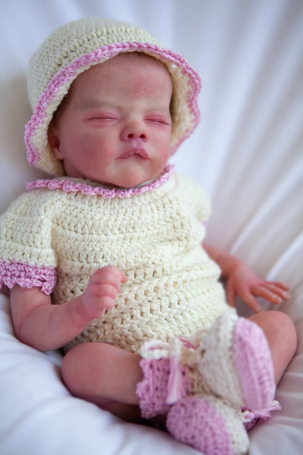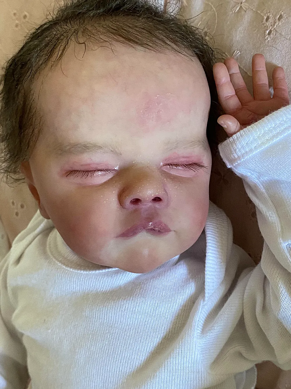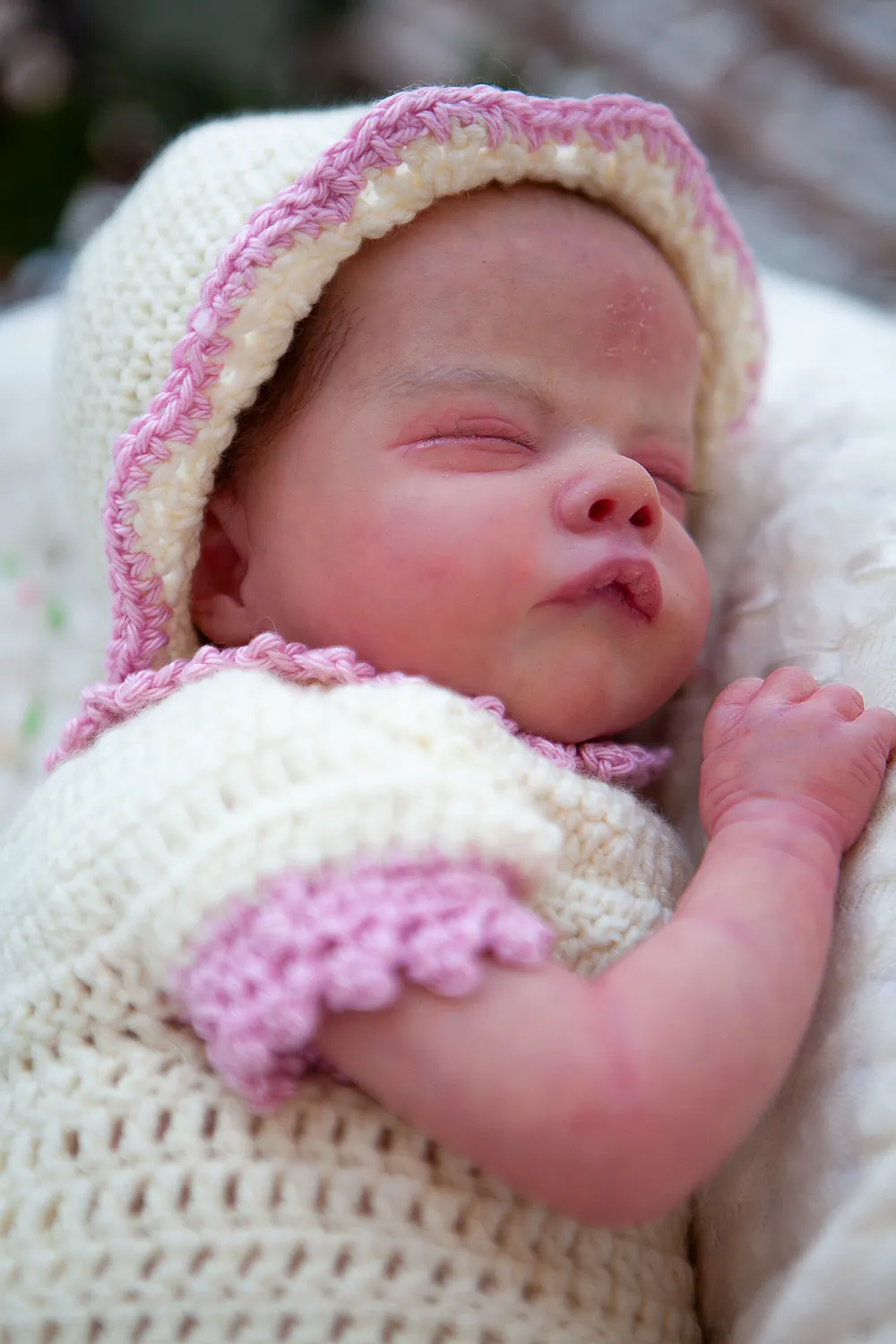 Welcome Lil Prem, an exquisite 15-inch limited edition, sleeping Preemie baby girl by master sculptor Laura Lee Eagles, rebornered by Deborah K for Dreamy Silicone Reborns. Her soft silicone limbs are professionally painted with many layers of Genesis heat set paints and sealed with matte sealer. Lil Prem features incredible newborn details like milia, capillaries, and mottled fair skin. She weighs 3 lbs 4 oz, weighted with fine glass beads and premium soft polyfill to feel like a real preemie. Her hair and lashes are directional micro rooted with premium deep dark brown mohair.
