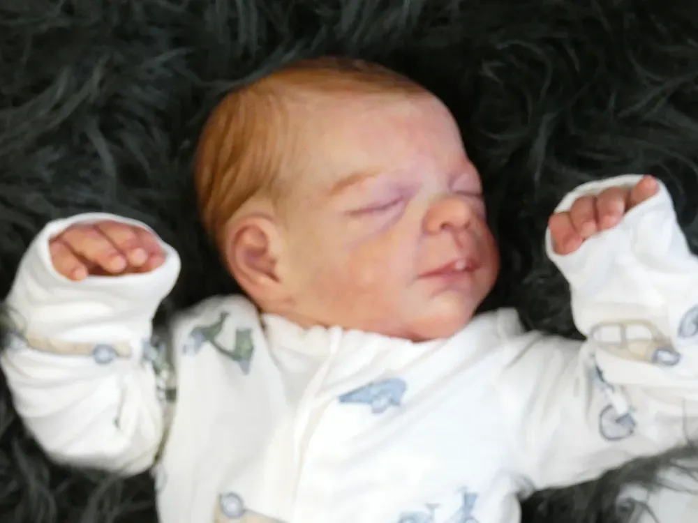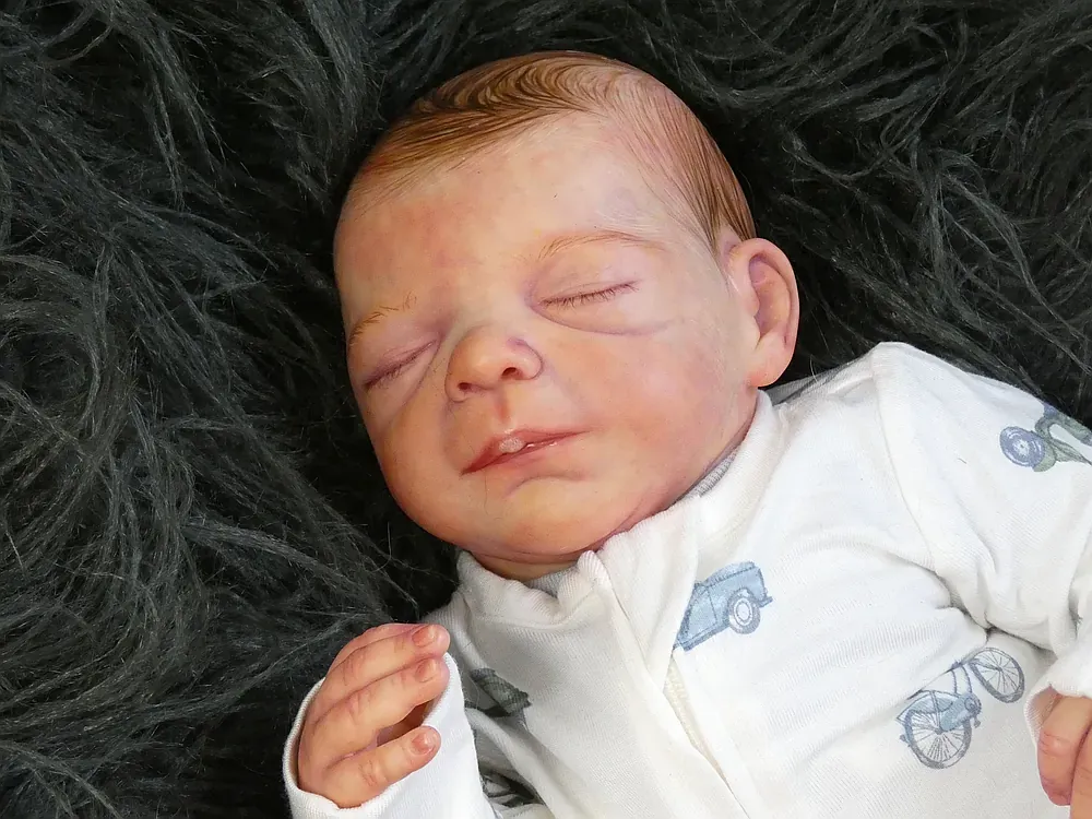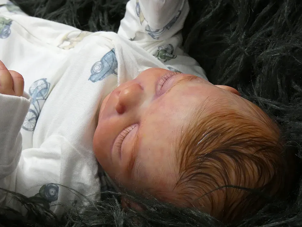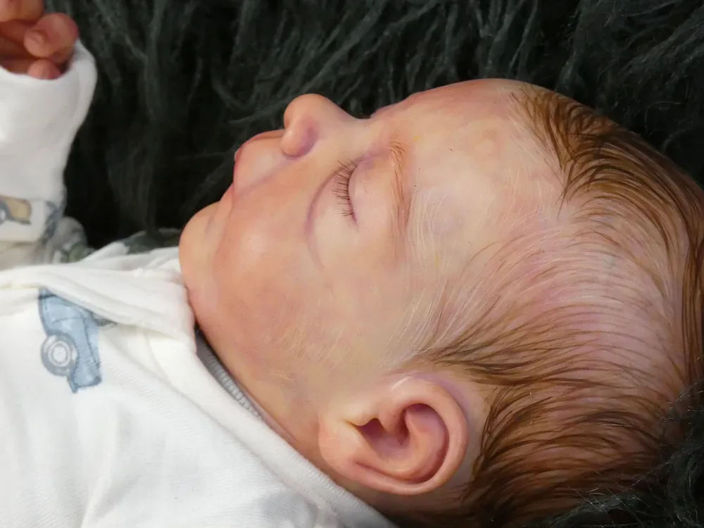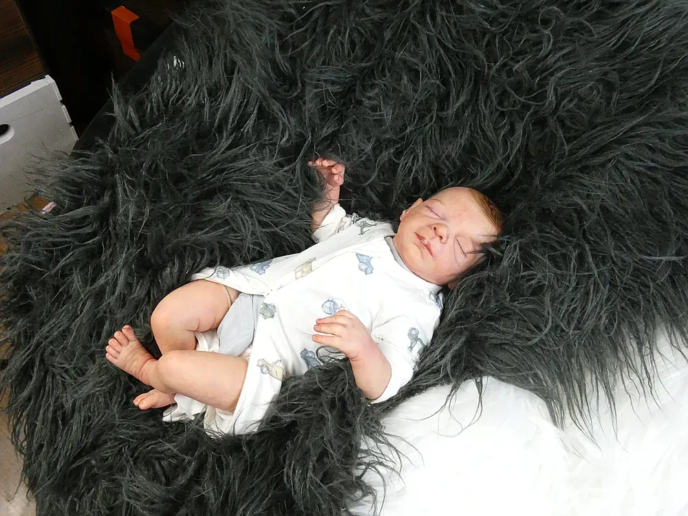 Milo is an all-silicone reborn boy, sculpted by Nikki Johnston. This doll is a testament to the artist’s paint skill, featuring intricate texture and color layering using RebornFX paints. Bald with rooted lashes. Weighted internally for a firm yet cuddly feel.