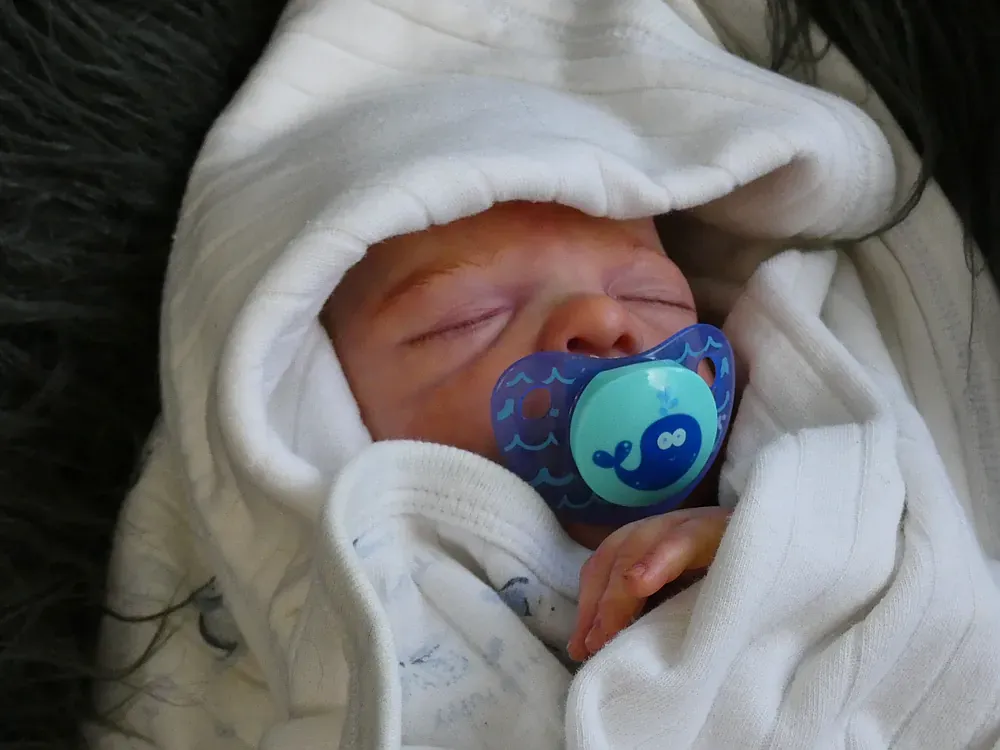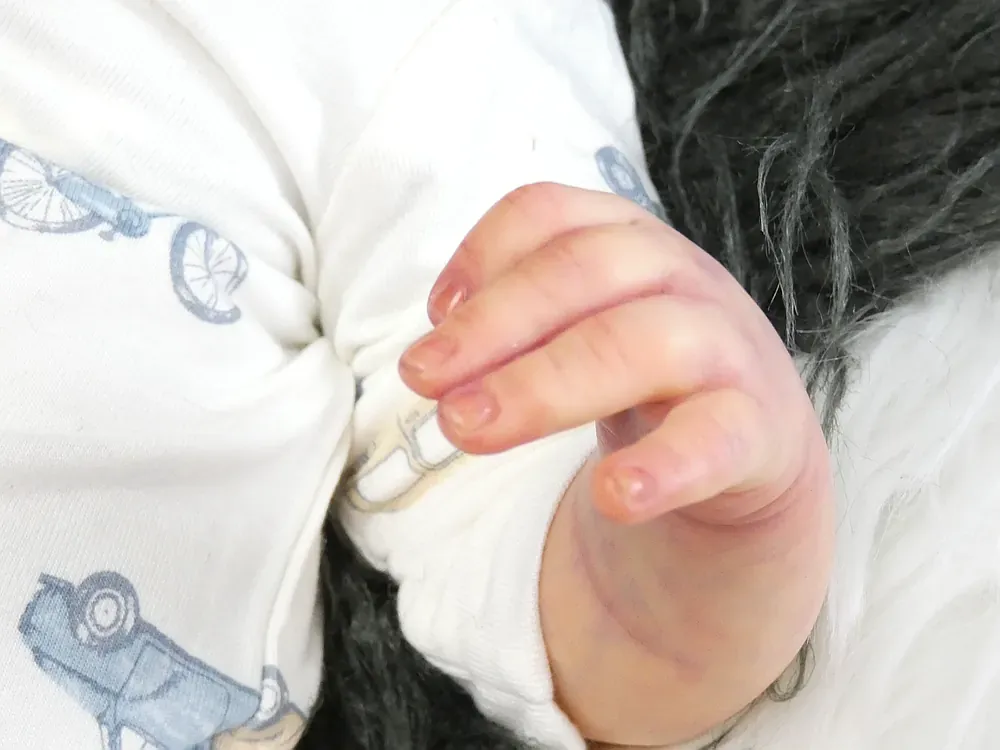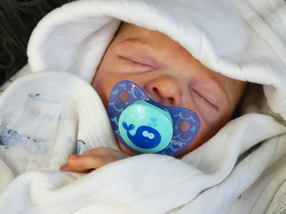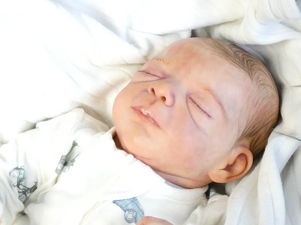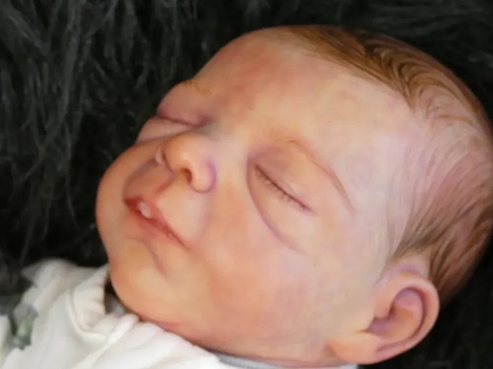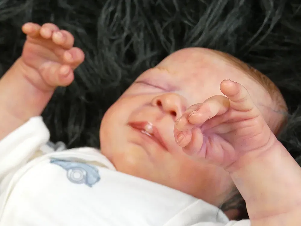 Milo is an all-silicone reborn boy, sculpted by Nikki Johnston. This doll is a testament to the artist’s paint skill, featuring intricate texture and color layering using RebornFX paints. Bald with rooted lashes. Weighted internally for a firm yet cuddly feel.