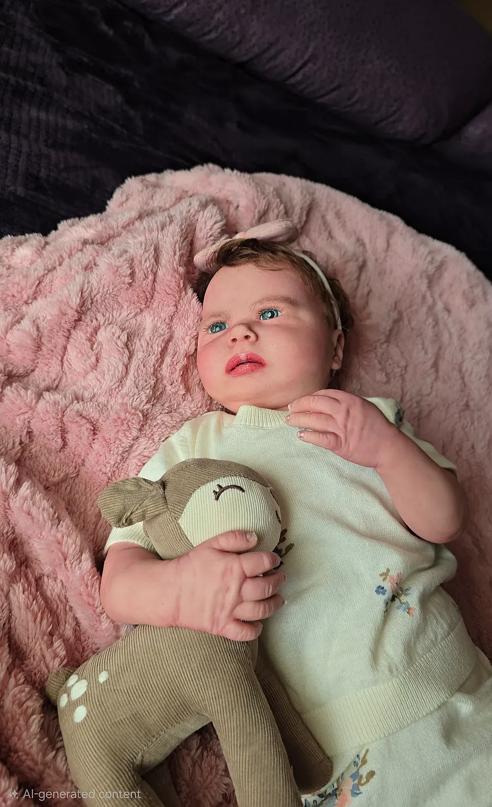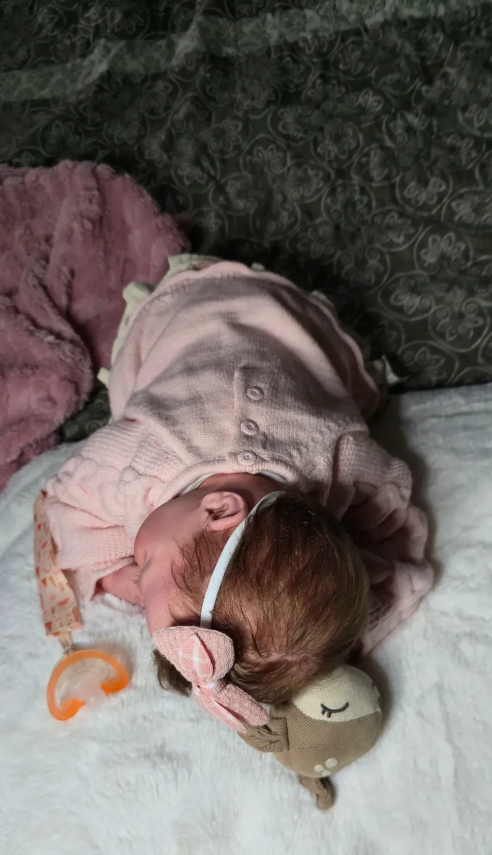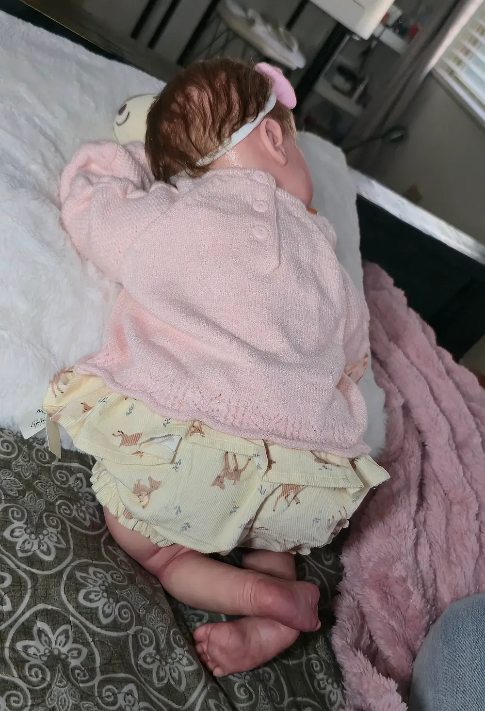 Welcome Nova, a stunning redhead from a Sold Out Limited Edition (SOLE) kit by Denise Farmer. Nova features full silicone limbs on a cloth body. She is painted with GHSP, featuring soft blushing and subtle newborn freckles across her nose. Her bright red hair is meticulously micro-rooted and sealed.