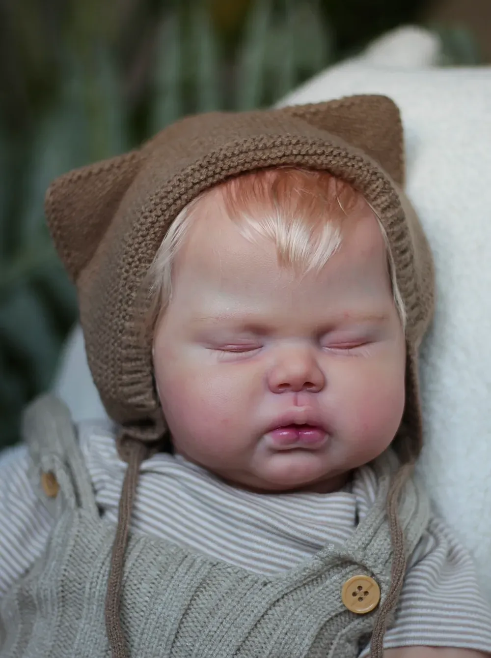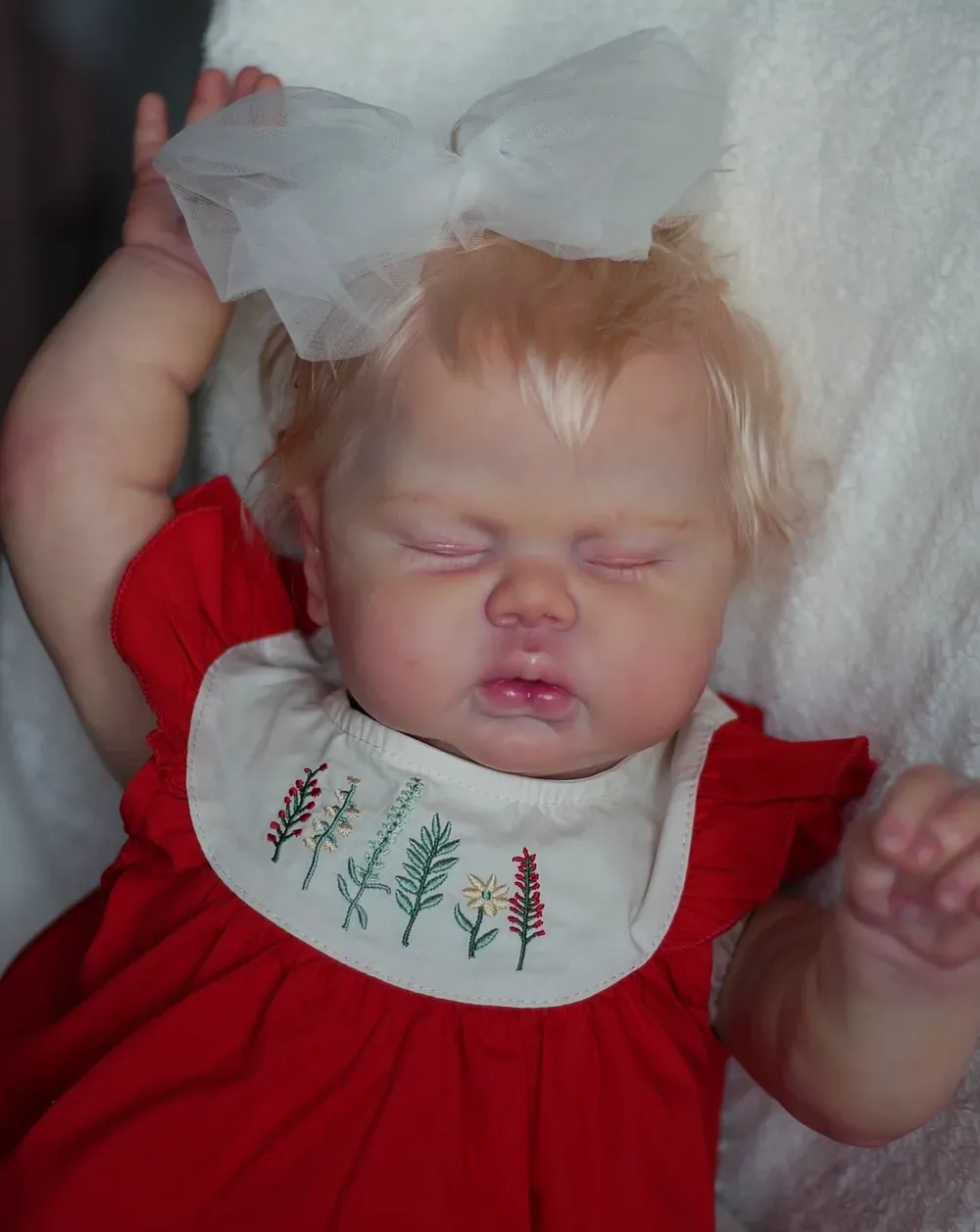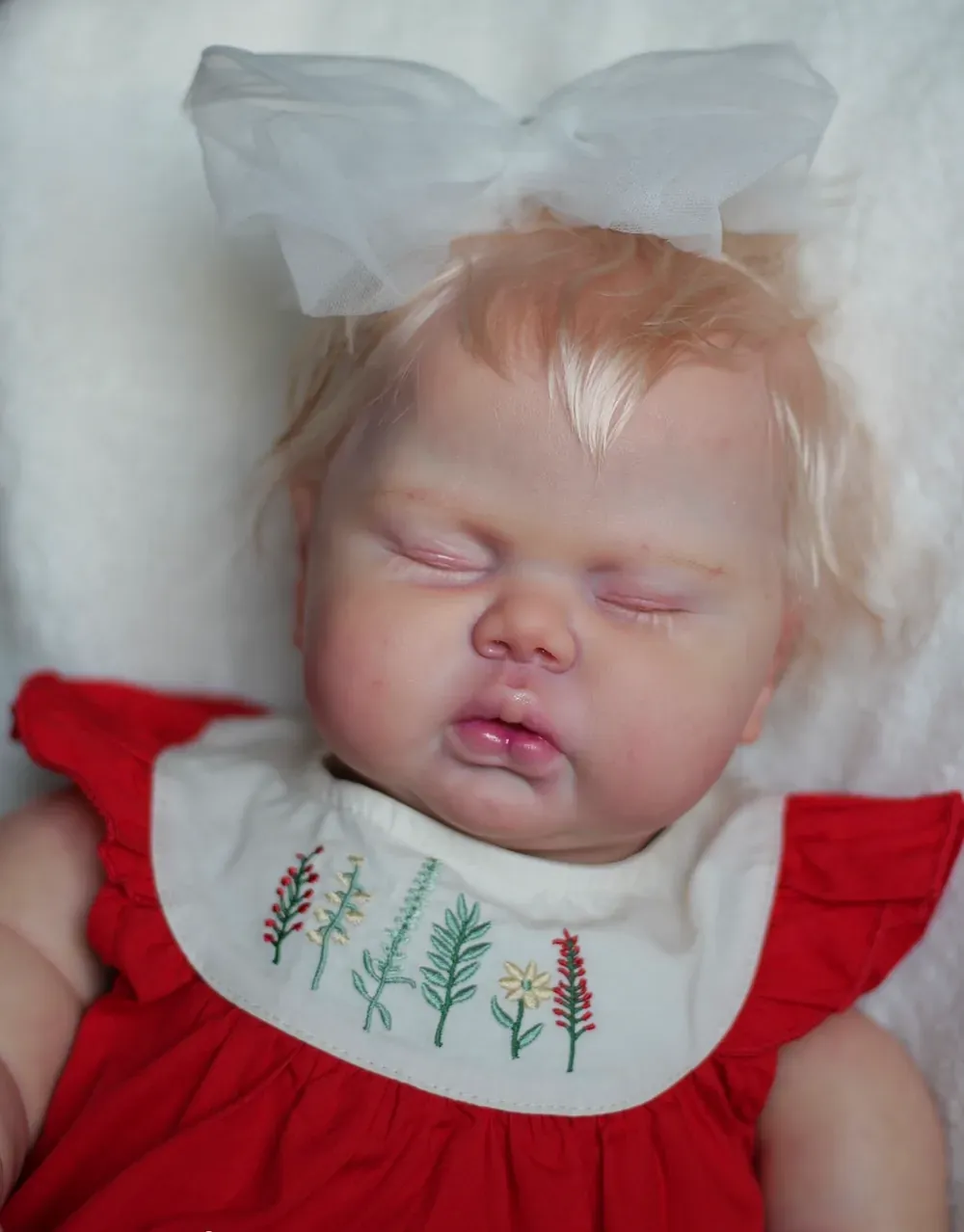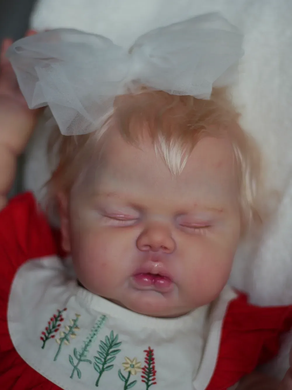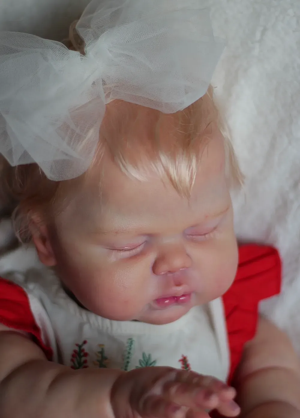 Stella is a sold-out limited edition preemie girl, 16 inches long, sculpted by Michelle Fagan. She is has blonde hair with rooted lashes, allowing her delicate head shape and paintwork to stand out. Full silicone arms and legs on a silicone body. She features a fair, mottled skin tone.