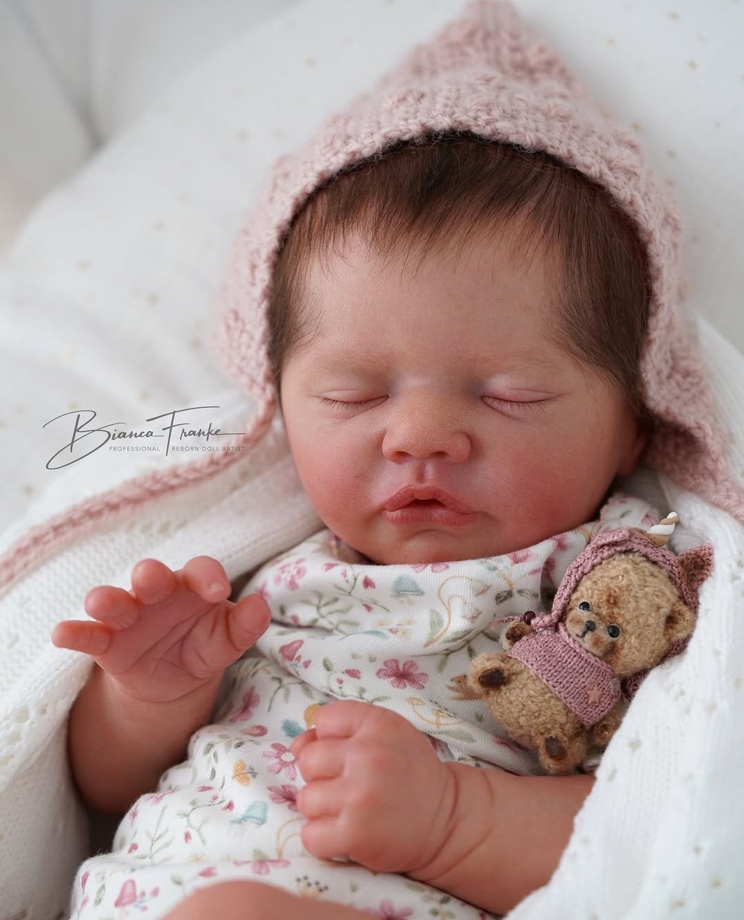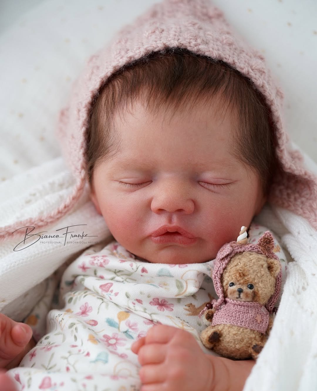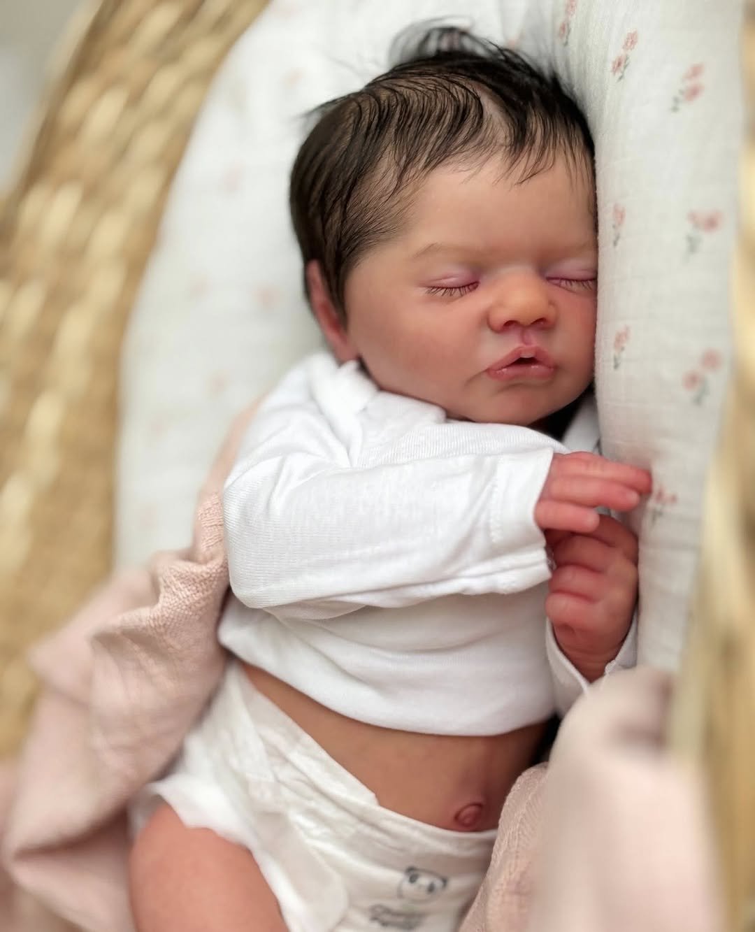 Wren is a Sold Out Limited Edition (SOLE) baby girl from the Realborn kit, brought to life with intricate artistry. She features full silicone arms and legs on a fully silicone body. Her hair is directional micro-rooted black mohair, sealed for durability. A high-value collector’s piece.