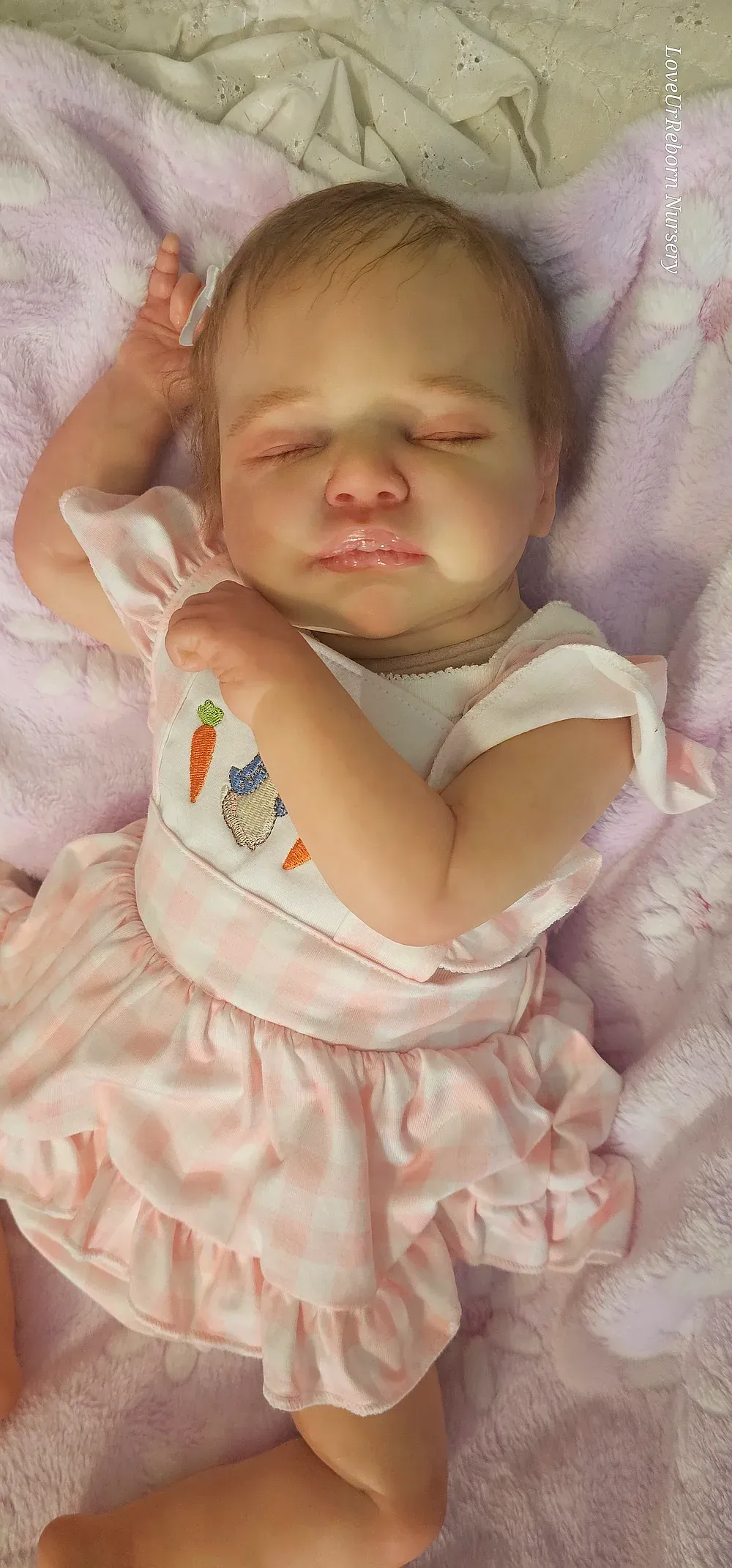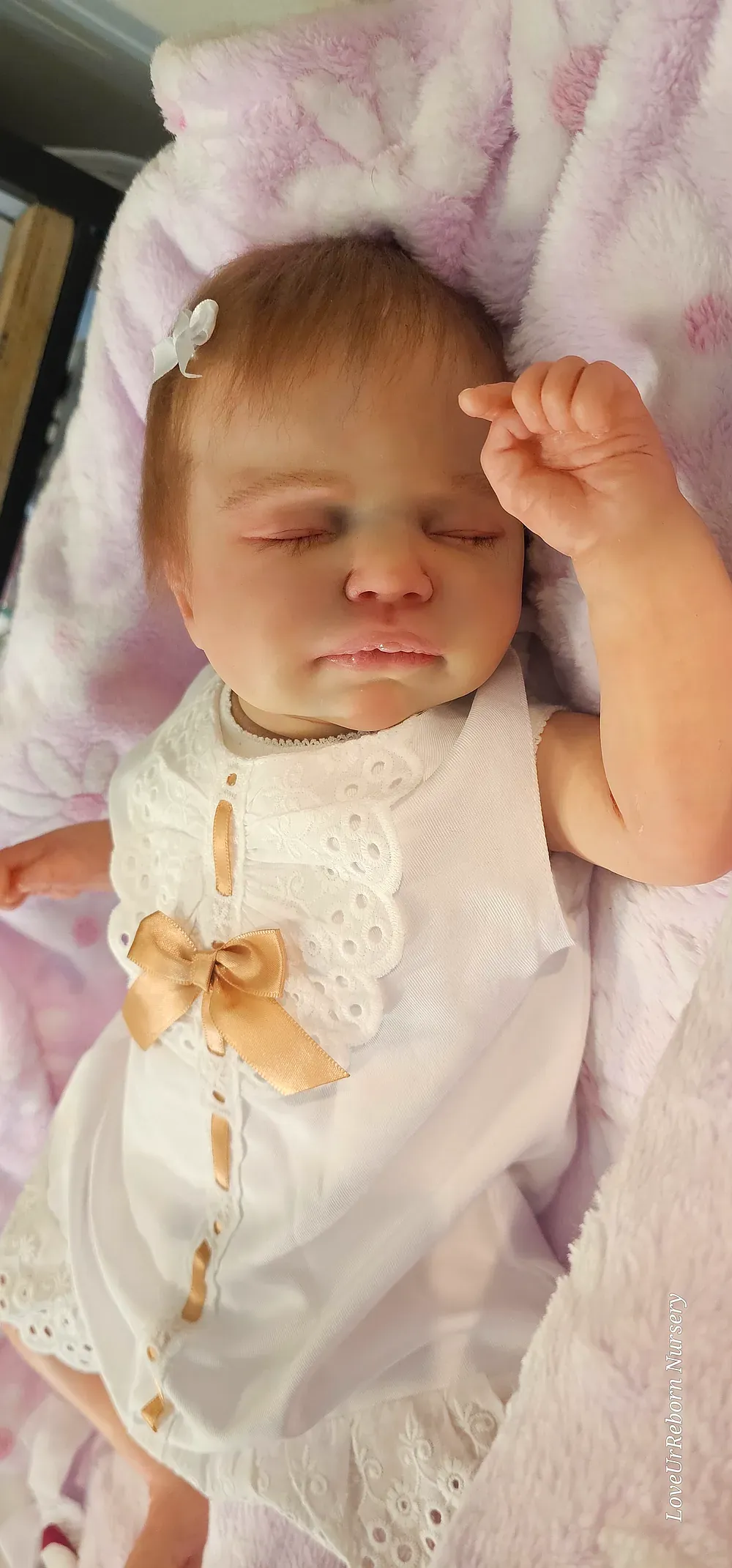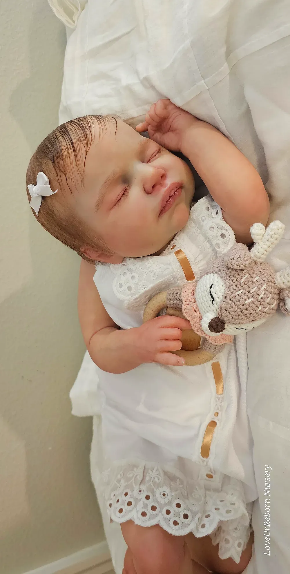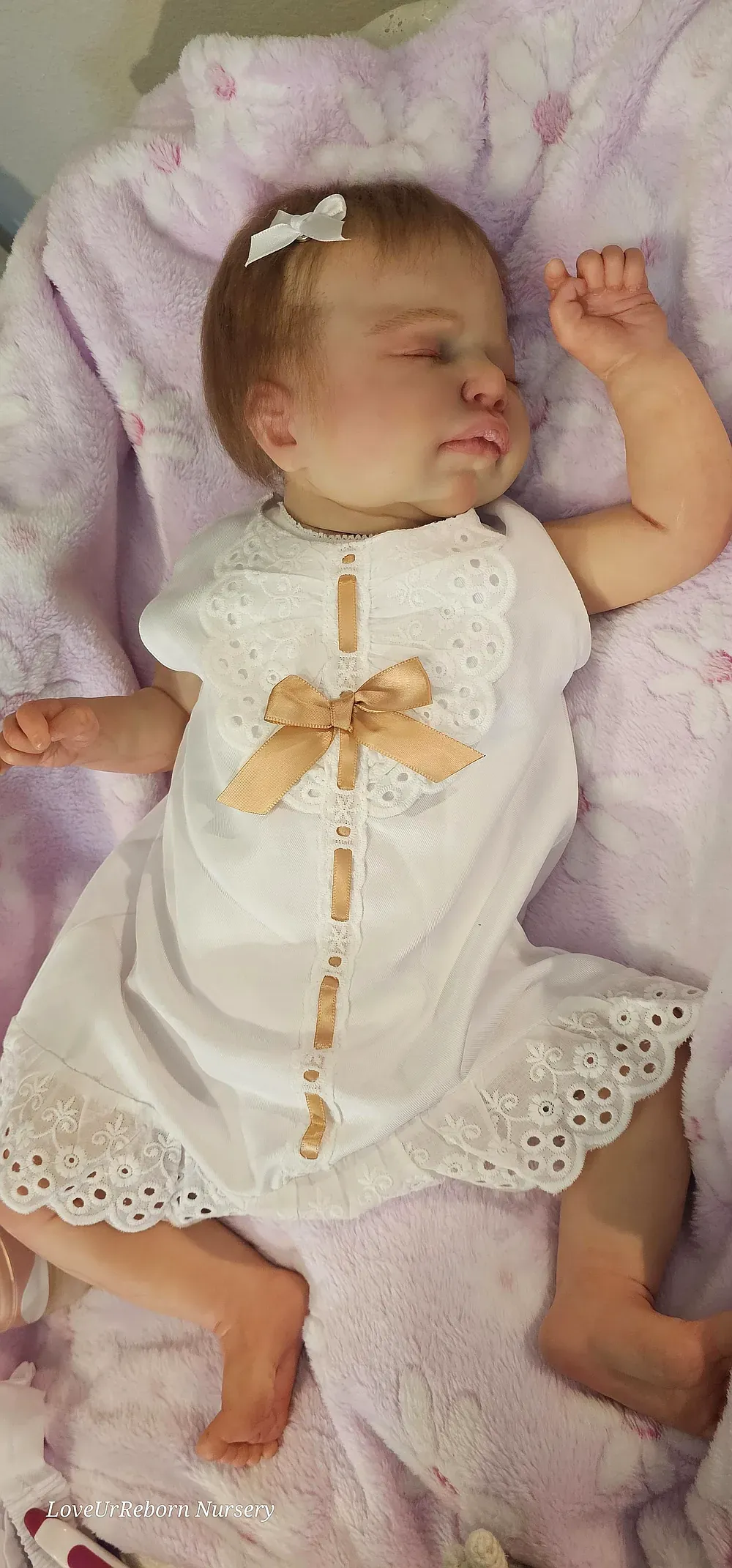 Zara is an ultra-realistic platinum full body silicone newborn girl. Poured in a super-soft blend for maximum movement and realism. She has a perfectly painted 3D-textured eyebrows and rooted lashes. She is bathable and comes with her own care kit.